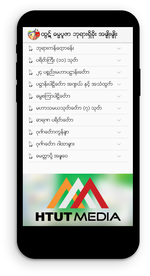 HTUT Media မှနေ မြန်မာလူမျိုးများ ဗုဒ္ဓဘာသာဝင်များ အတွက် ထွဋ် ဓမ္မပူဇာ ဘုရားရှိးခိုး အမျိုးမျိုးကို နေ့စဉ် ဘုရားရှိးခိုး အမျိုးမျိူး မိုဘိုင်း အက်ပလီကေးရှင်းကို ထုတ်ဝေလိုက်ပါတယ်။ ထွဋ် ဓမ္မပူဇာ ဘုရားရှိးခိုးအမျိုးမျိုး မိုဘိုင်း အက်ပလီကေးရှင်းတွင် ပါဠိဘာသာ ကို မြန်မာ အသံထွက် ဖေါ်ပြပေးထားသောကြောင့် အလွန် အသုံးဝင်မယ့် အက်ပလီကေးရှင်း တစ်ခု ဖြစ်ပါသည်။